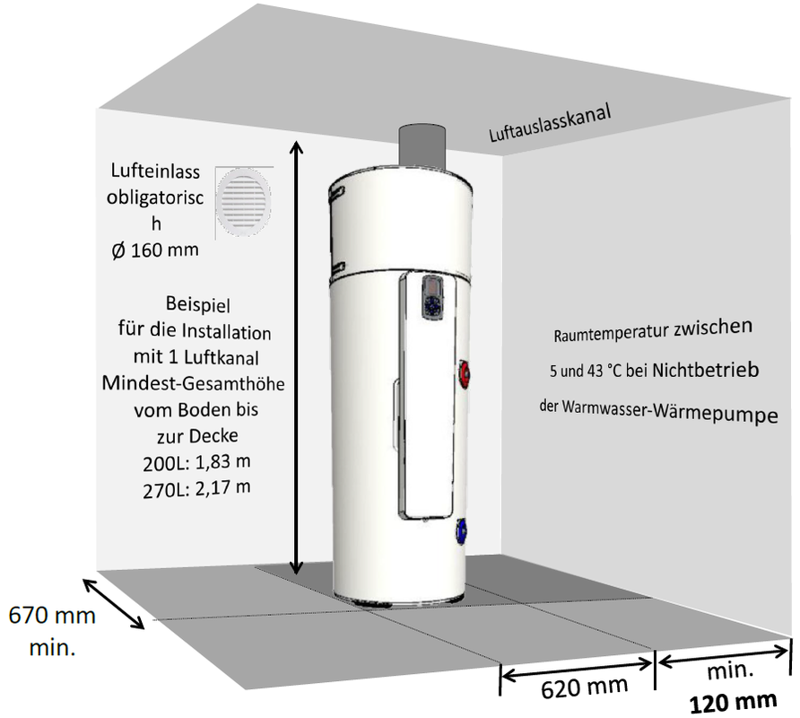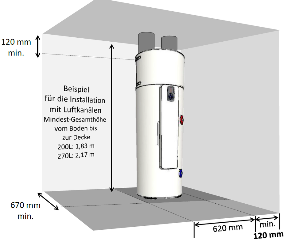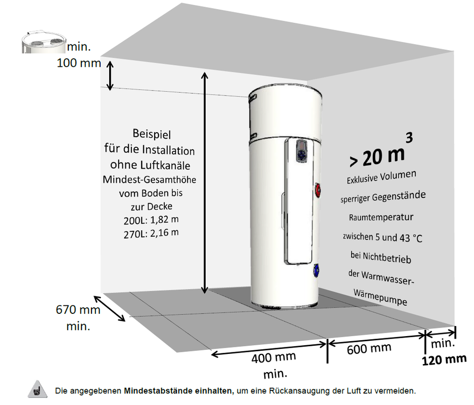 Der Wärmepumpenboiler kann im Umluftbetrieb arbeiten, wenn der Umgebungsraum eine Mindesttemperatur von 5°C hält. Das Nettoraumvolumen muss 20 m³ überschreiten und der Raum muss min. 10 cm höher als das Gerät sein.