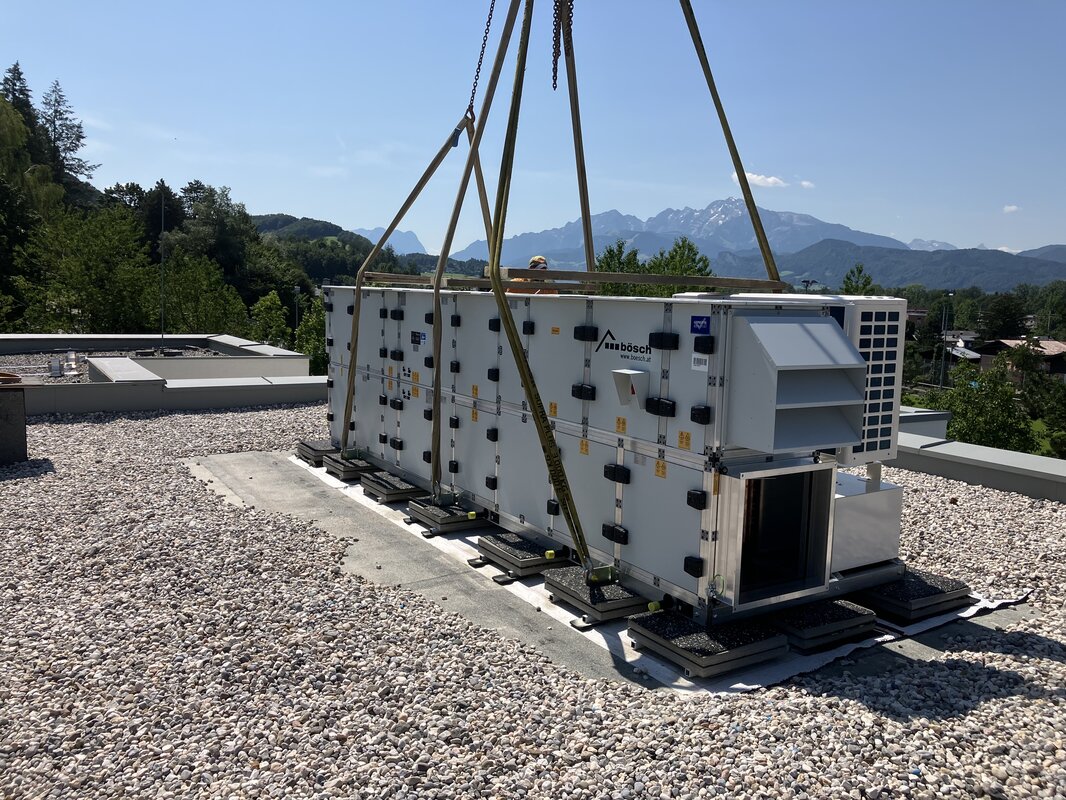 Das Highlight der technischen Erneuerung stellt das auf dem Dach montierte RLT-Gerät von bösch dar. Als Teil der OPTIMA COMPLETE Serie wurde das System als Plug&Play-Lösung konzipiert und vormontiert geliefert. Alle Komponenten (Klimagerät, Wärmepumpe & Regelung) sind auf einem leicht transportablen Grundrahmen montiert. Das Gerät musste also nur noch an seinem endgültigen Aufstellungsort platziert und an das Verteilsystem angeschlossen werden.