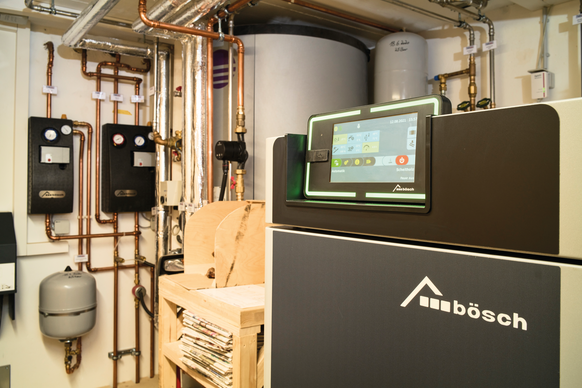 Die neue Biomasseanlage übernimmt die gesamte Gebäudeheizung und Warmwasserversorgung für das 4-Parteien-Haus. Unterstützung kommt von den zwei bestehenden Solaranlagen. Über sie wird bei Sonnenschein das Brauchwasser und der Puffer erwärmt. Beide Anlagen in das neue System einzubinden erforderte etwas Scharfsinn und Fingerspitzengefühl, wurde vom bösch Kundendienst aber, wie gewohnt, gut gemeistert. Und so bringt auch die Sonne ihren wertvollen Beitrag zu einem sparsamen Betrieb der neuen Heizungsanlage.