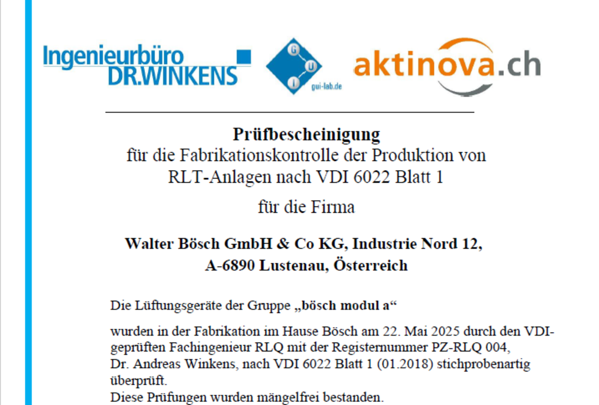 Als einziger Hersteller werden bei bösch nicht nur die Geräte gemäß VDI 6022 geplant und gebaut. Unsere Mitarbeiter nehmen auch regelmäßig an den in der Richtlinie defnierten Schulungen teil und sind dementsprechend A-zertifiziert.